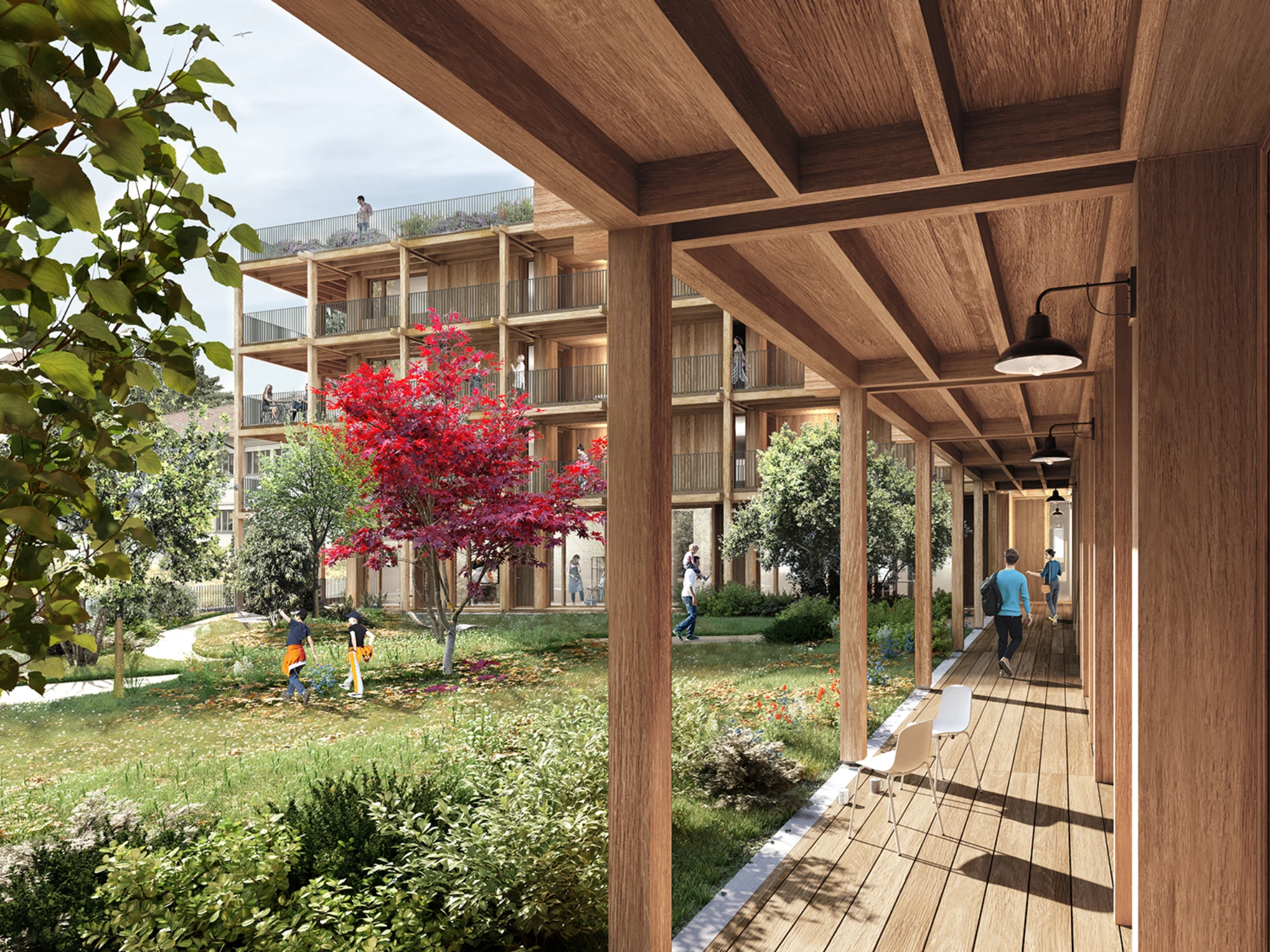Bei der Weiterentwicklung zum Richtprojekt wurde die Fassade neu ausgebildet und umschliesst die darüberliegenden Innen- und Holzfassaden wie eine schützende, steinerne Klammer. Das neu integrierte Vordach mit angemessener Tiefe (EG/ 1.OG) betont nun das «Piano Nobile» im 1. Obergeschoss gekonnt und vermittelt geschickt zwischen dem öffentlichen Erdgeschoss und dem halböffentlichen sowie privaten Bereich im Obergeschoss. Die öffentlichen Frei- und Verkehrsräume auf Stadtebene wurden zu qualitätsvollen Begegnungs- und Aufenthaltsräumen für das Quartier aufgewertet.